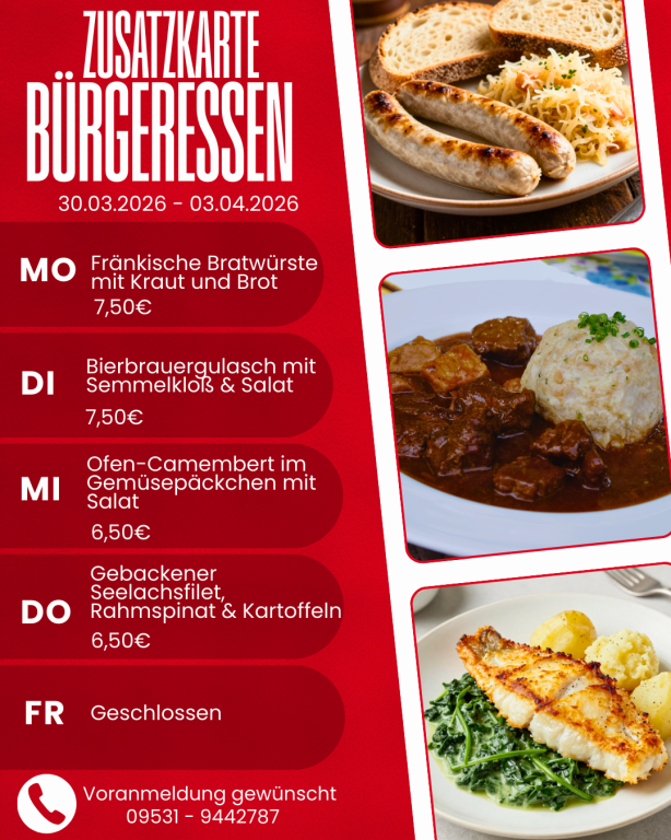 Melden Sie sich zum Bürgeressen bitte an! Täglich bis spätestens 10:00 Uhr unter der Telefonnummer 09531-9442789 kurz anmelden. Wir decken dann schon Ihren Platz ansprechend ein.