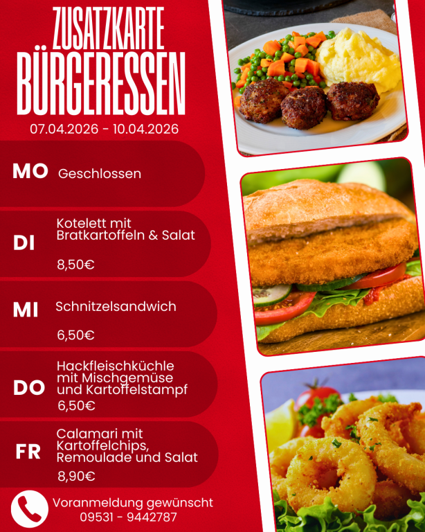 Melden Sie sich zum Bürgeressen bitte an! Täglich bis spätestens 10:00 Uhr unter der Telefonnummer 09531-9442789 kurz anmelden. Wir decken dann schon Ihren Platz ansprechend ein.